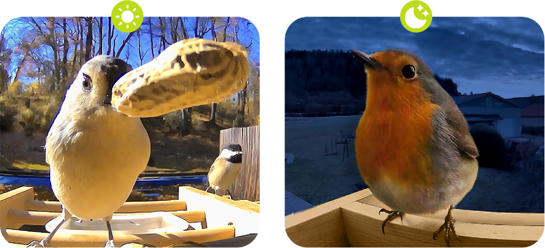 Captures stunning close-up bird buffet moments, day and night.