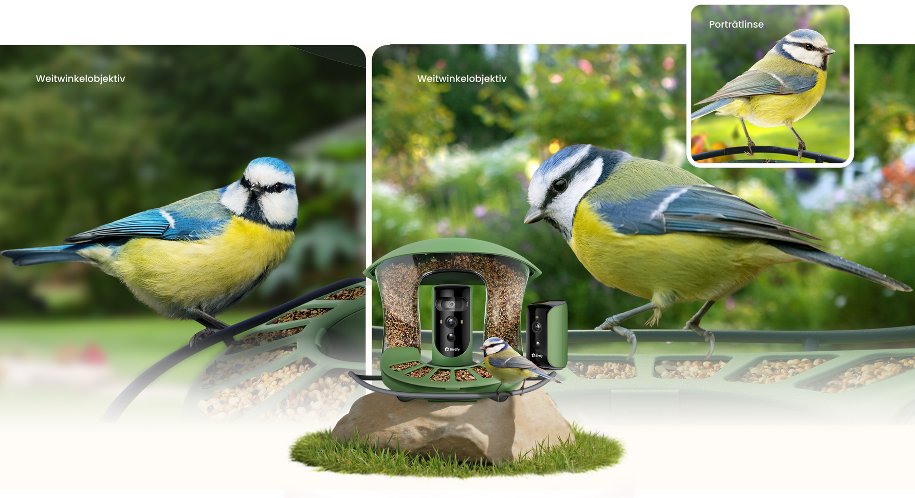 Während das Weitwinkelobjektiv Videoclips aufnimmt, zoomt das intelligente Porträtobjektiv automatisch heran und sendet federscharfe Vogelfotos direkt auf Ihr Gerät - so wird Ihr Garten zum Ziel für jeden Vogelbeobachter.