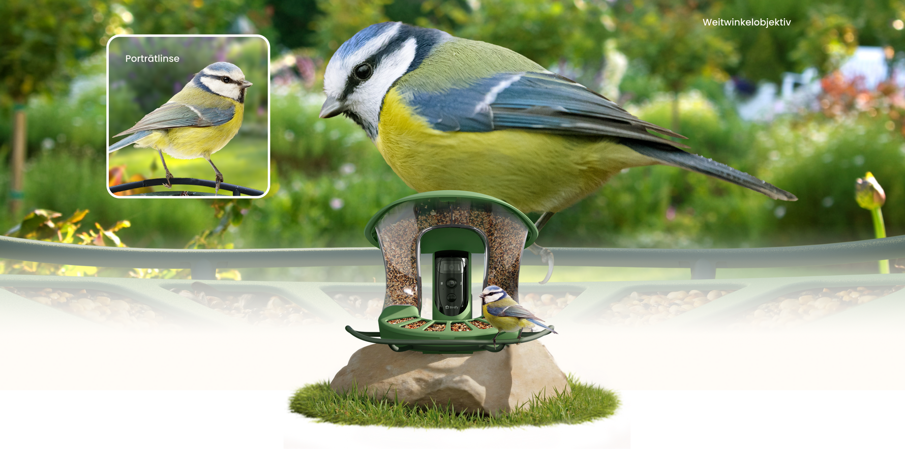 Während das Weitwinkelobjektiv Videoclips aufnimmt, zoomt das intelligente Porträtobjektiv automatisch heran und sendet federscharfe Vogelfotos direkt auf Ihr Gerät - so wird Ihr Garten zum Ziel für jeden Vogelbeobachter.