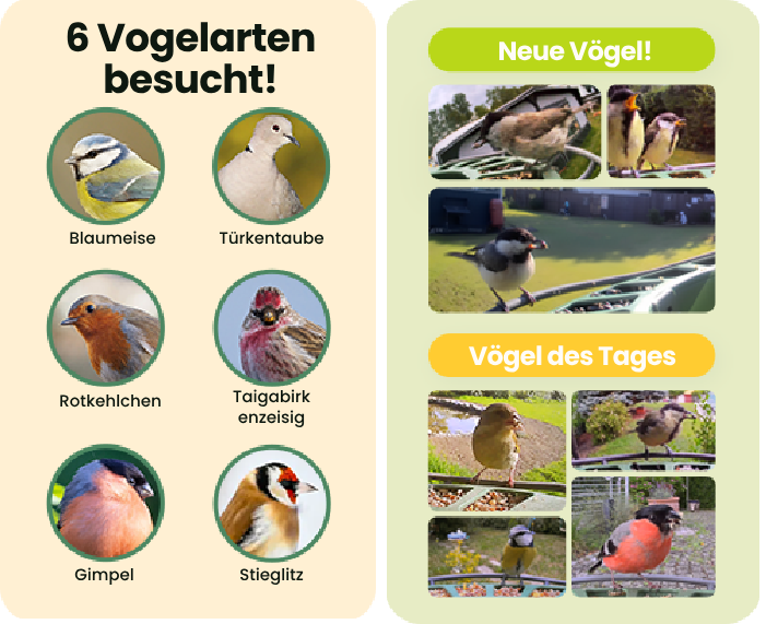 Lernen Sie und haben Sie Spaß mit der KI, die mehr als 6.000 Vogelarten identifiziert. Verwandeln Sie Ihren Garten in ein Lernparadies und entdecken Sie die reiche Vogelwelt um Sie herum.